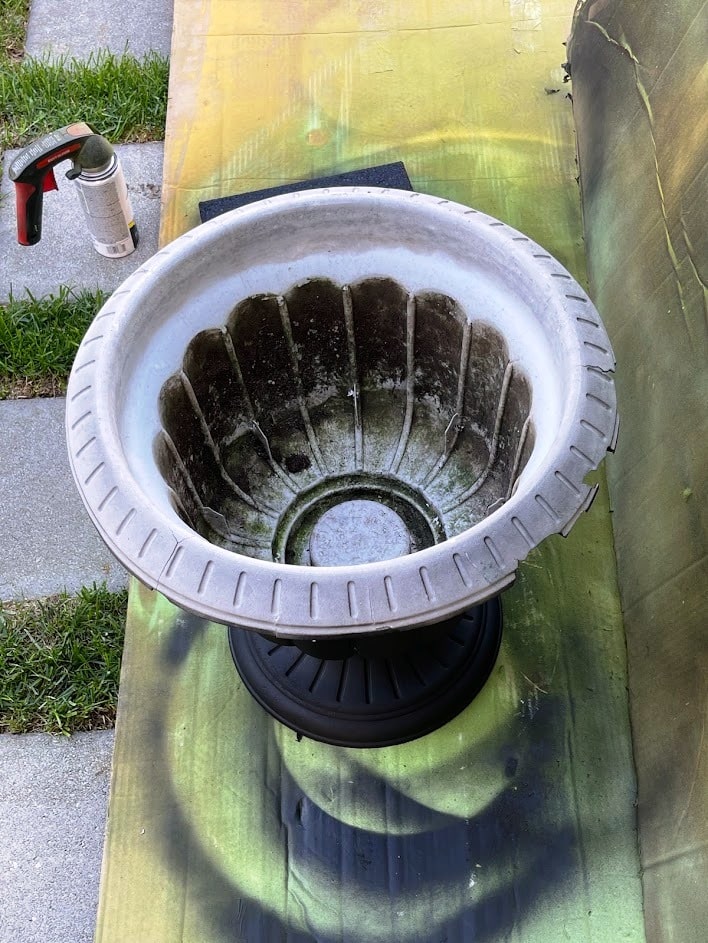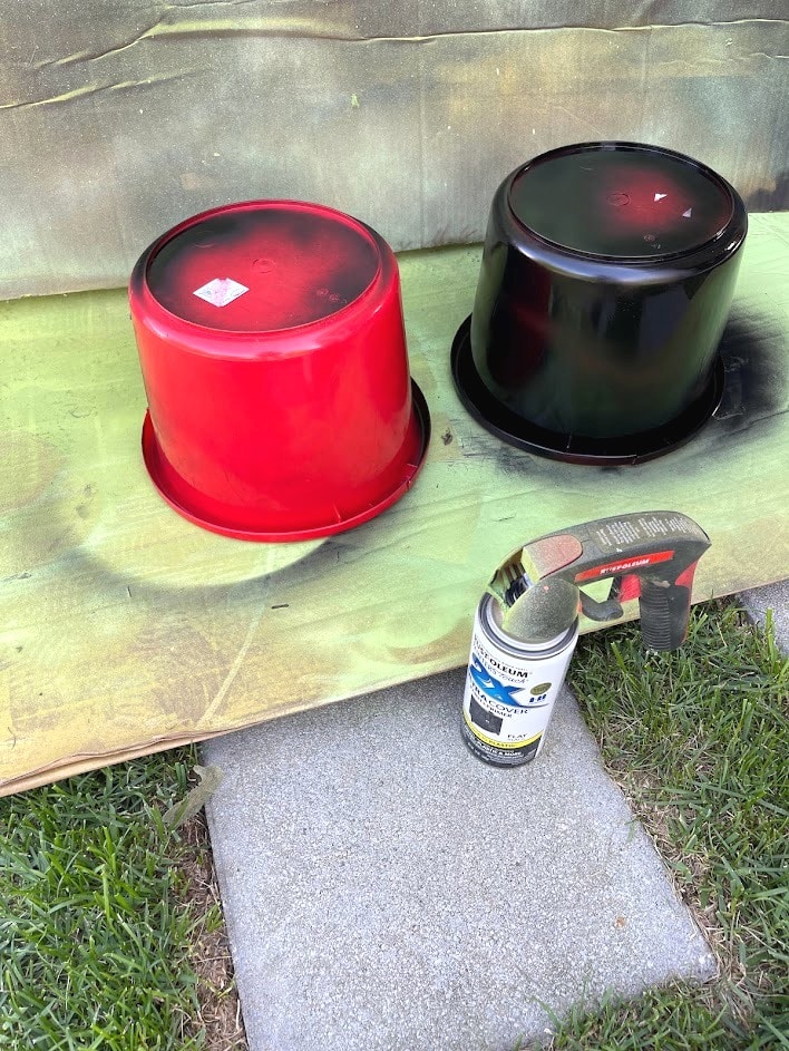 The first step was to empty the dirt, wash the pots and give them a coat of protection. When I was researching how to create a concrete look on a plastic container, one of the suggestions was to rough up the surface by sanding the plastic. I decided to skip that step and use a spray paint that has primer in it. I figured that would provide the surface I needed. I sprayed each piece with just one coat of Rust-oleum 2X in flat black. The red containers are buckets that I bought to use as bases for a couple of planters that aren’t pictured here.