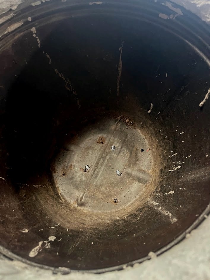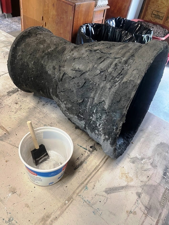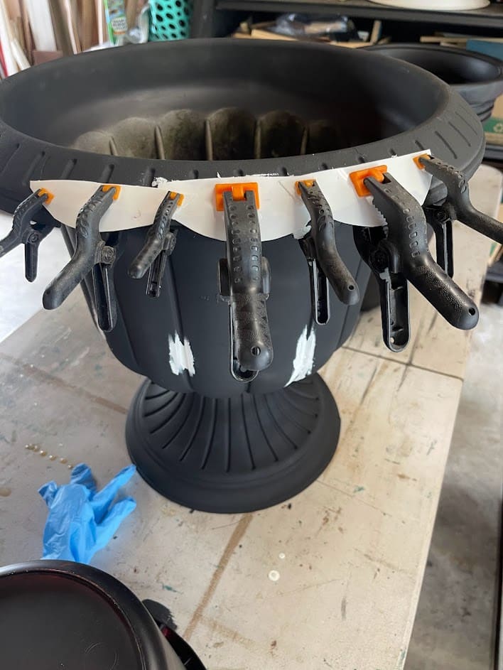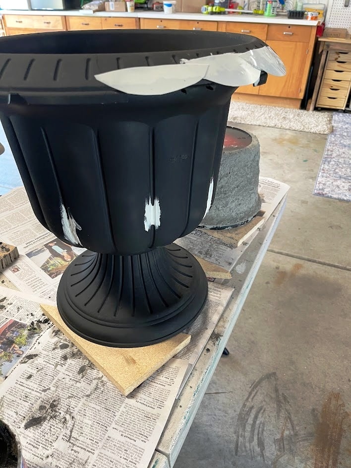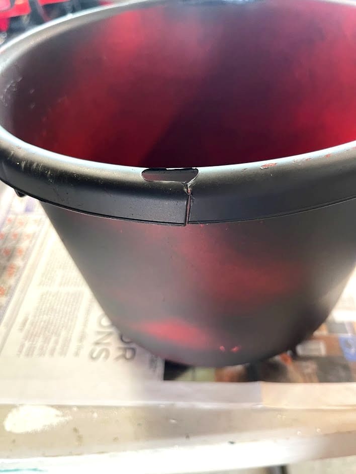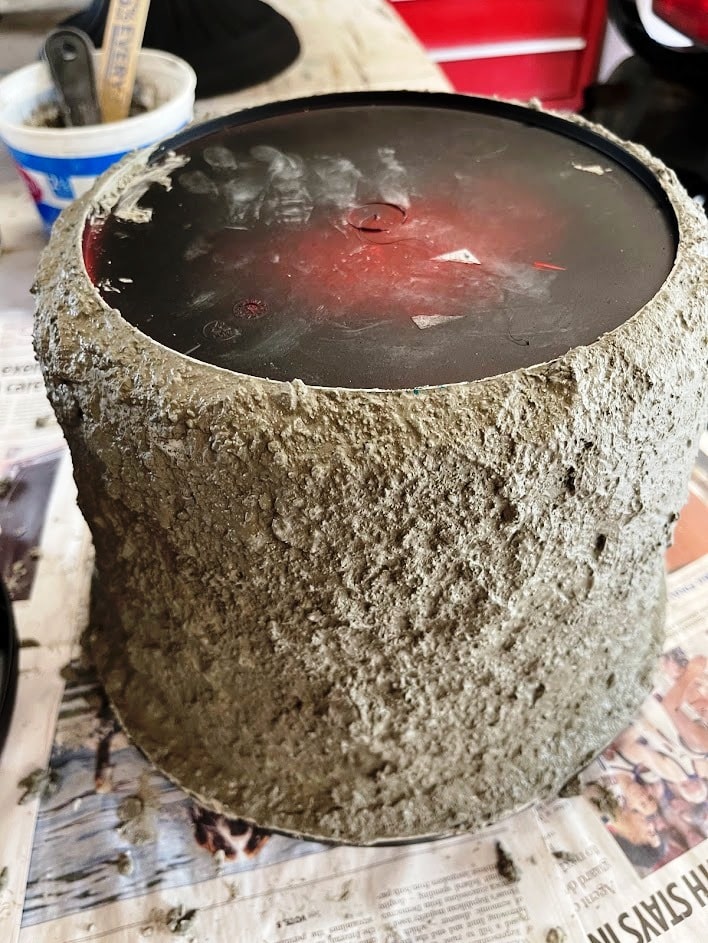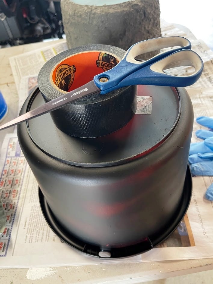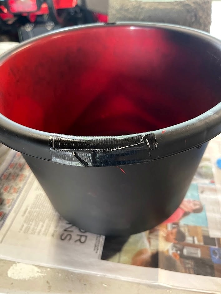 Before adding a concrete look to the urn planter, I decided to repair the broken edge. The planter is pretty old, and the edge is brittle. I figured I’d try to both repair the broken section and help prevent more breakage by doing so. I used a couple of lids from cottage cheese containers for the pieces. To attach them to the planter, I applied Gorilla Glue Rubberized Sealant to the back of the plastic pieces and clamped them into place. I also applied some of the product to drainage holes I had drilled in the side of the urn. I then drilled new holes in the bottom. The red buckets that I plan to use as bases for the other planters needed a bit of repair too. I bought the buckets and they came with a handle. To remove the handles, I had to cut the plastic. To fix the cut, I used Gorilla black duct tape. Will that hold up? Time will tell.