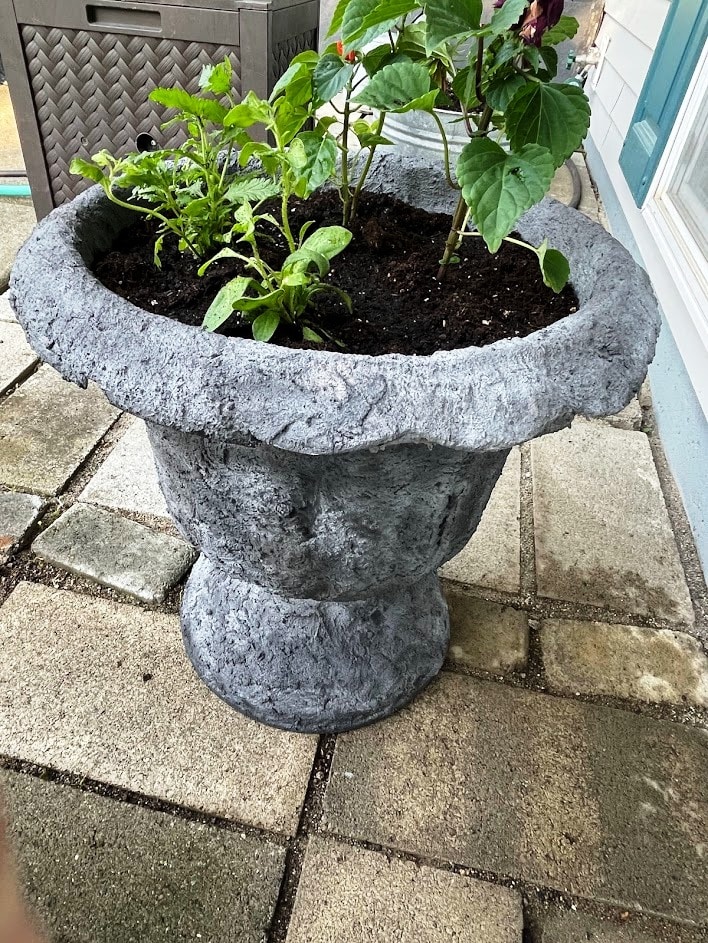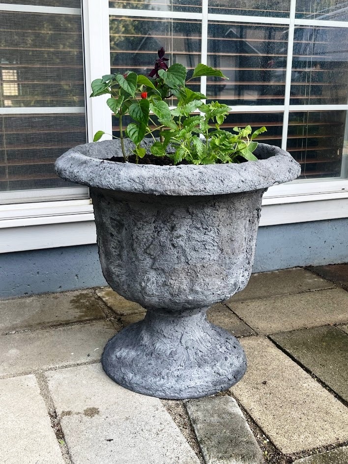 There are several ways to make a planter look like concrete. There are special spray paints, you can mix sand or baking soda into regular paint, use actual cement, or use grout. Since I had leftover grout on hand, I decided to use grout and sand together. I didn’t have a recipe for the mixture so I poured some grout and sand into a container then added water until I had a consistency that I thought would stick to the planters without being too thick. I started applying the grout with a paint brush but found it easier to do with my hands. To protect my hands during the process, I wore nitrate gloves. The edge of the urn got bumped before the grout dried and a bit of it fell off the repaired section. I added more grout and it seems to be holding up well. I also applied grout along the inside of the top of each planter since that is visible when it is filled with dirt.