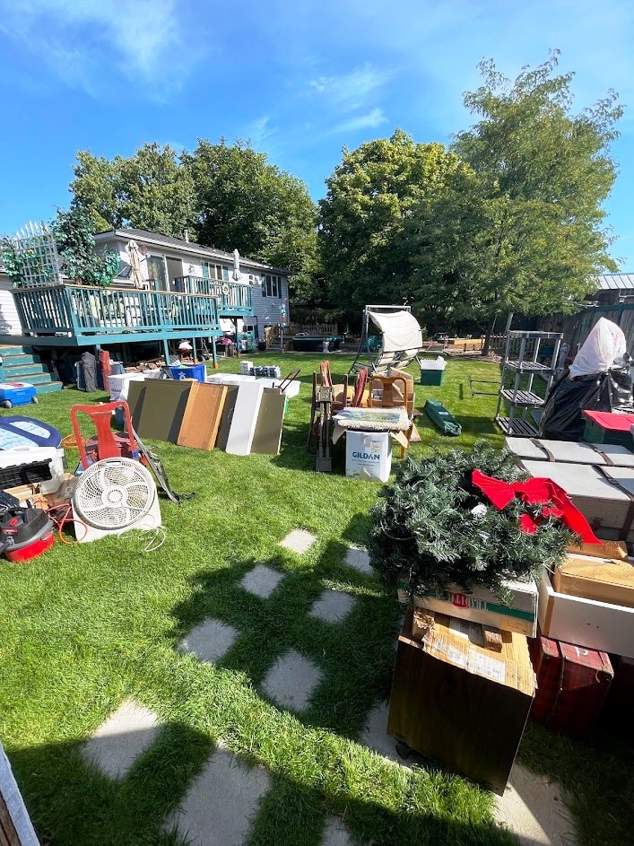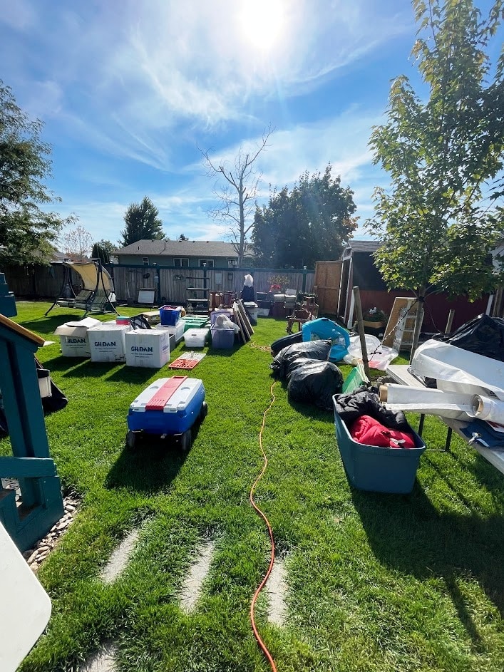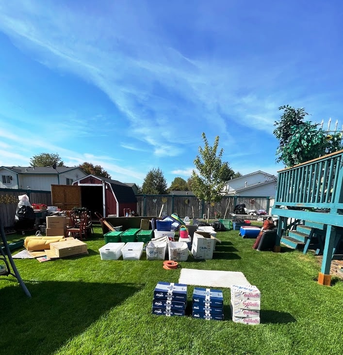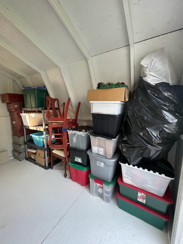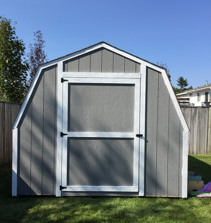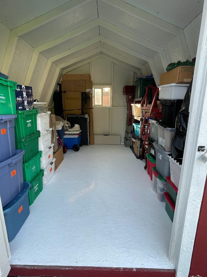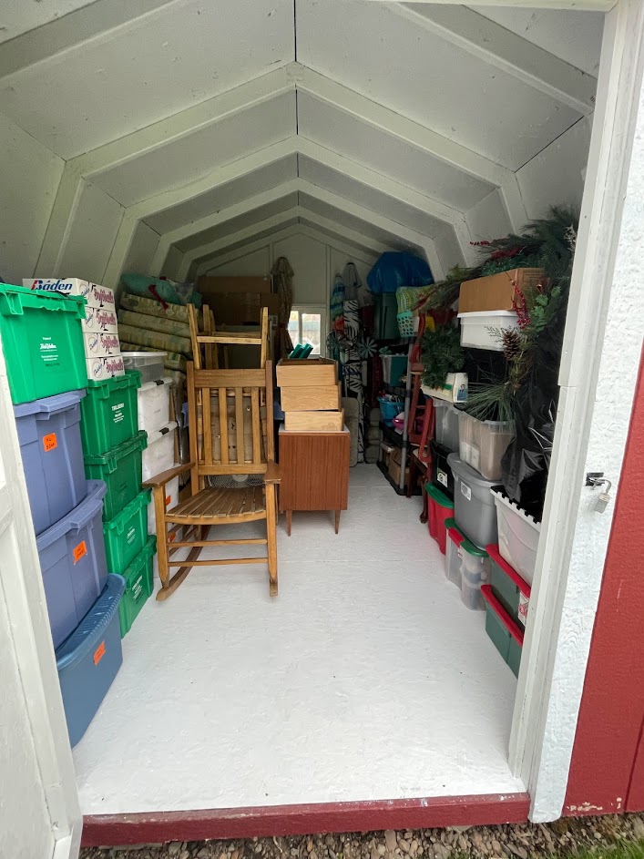 We have a 10 x 12′ storage shed in our backyard. We had it built several years ago and use it to store supplies from when hubby ran softball tournaments, Christmas decorations, outdoor decor, and some misc items. Over the years, I’ve done a little organizing but this year, I decided we needed to completely empty it and get rid of things we no longer need. While we had it empty, I thought it might be fun to paint the inside white! I had just painted the only dry-walled wall in our garage white, so I was in the mood to do more painting.