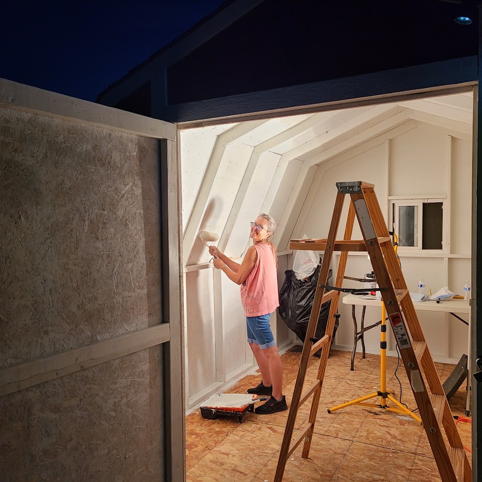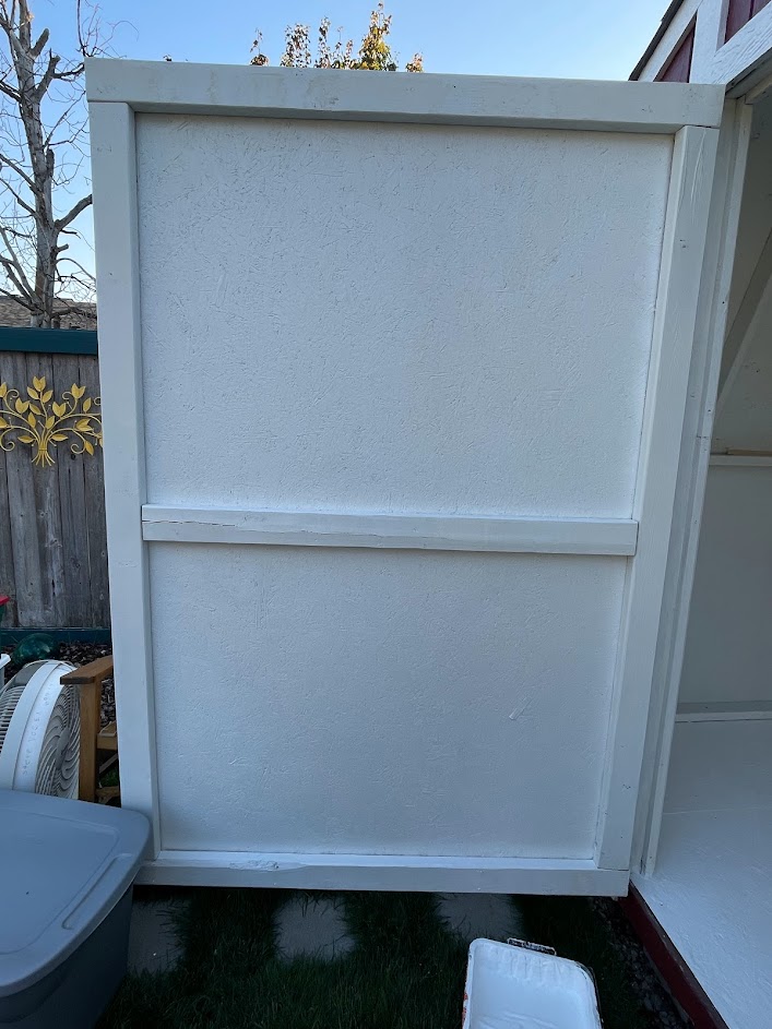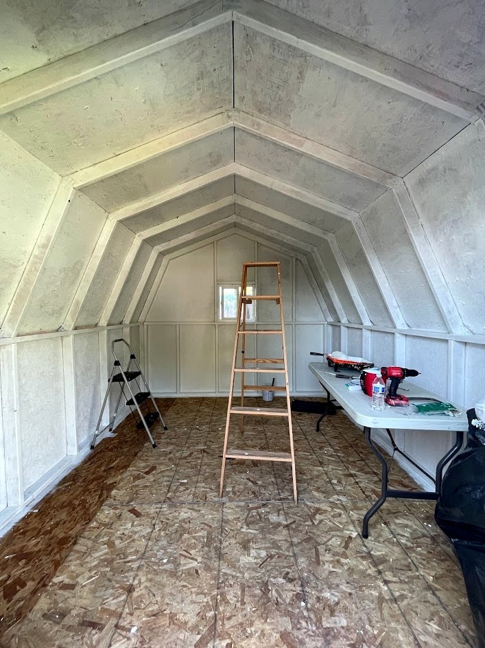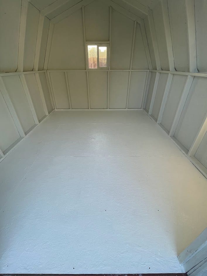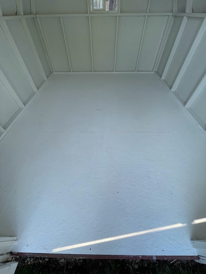 The first coat of paint soaked into the plywood really well. While it looked ok for a shed, I thought it would look better with a 2nd coat. As usual, the 2nd coat went faster but only a little. With all the nails poking through the ceiling, it was still slow going. Painting around each nail was tedious! With all the nails poking through the ceiling, those sections were tedious. Even with it being tedious, the 2nd coat was worth the effort!