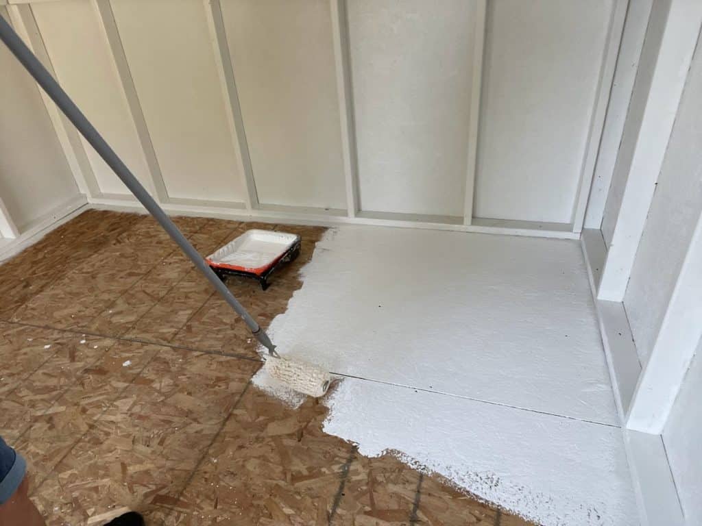 To paint the 2″ x 4″s, I used the angled paintbrush to apply the paint to the corners, then the 4″ foam roller for the flat surfaces. While I was painting the 2 x 4’s along the bottom of the walls, I also painted a 2″ strip on the floor. Since I planned to roll the floor, having the edges already painted would ensure the entire floor would be painted.