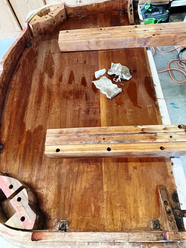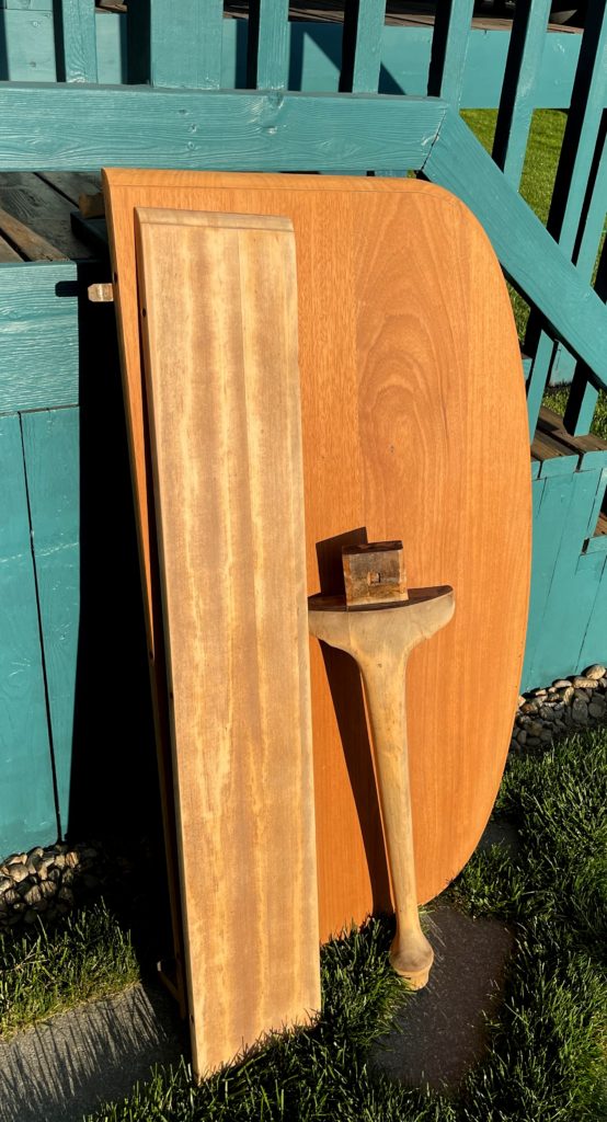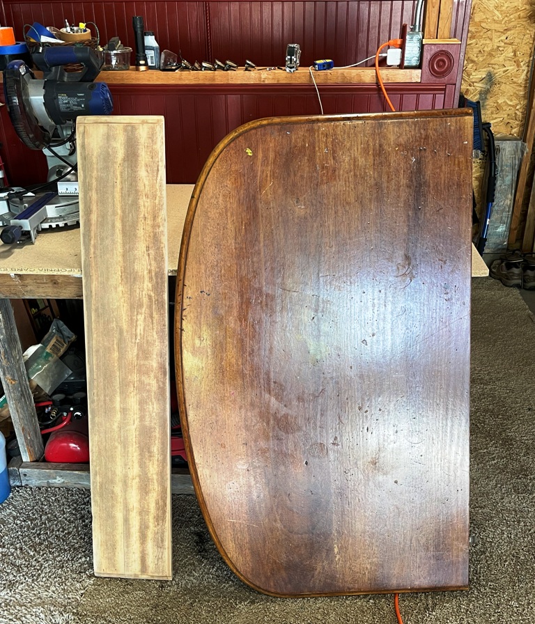 I chose to start the sanding on the leaf so I could get a feel for how the finish would come off. I’m not sure what we used 40+ years ago – maybe laquer – but it was still well-intact on most all of the surfaces.
