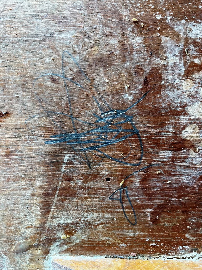After the legs were stripped and the wood was dry, I sanded them with my orbital sander and 220 grit sandpaper. For the extra curvy areas, I used a sanding block to remove any leftover finish and to smooth the wood. I’m not sure why I didn’t think of doing this when I applied the stripper, but I realized that I could set the legs back into the tabletop to hold them while doing the sanding. You can see that there is some green marker that did not come out of the wood with the stripper. I am ok with this because I am trying to preserve some of the history of what the table has been through. There are places where the old black ink shows, some of the deep scratches are still visible, and there are places where the red paint mom used is still there.