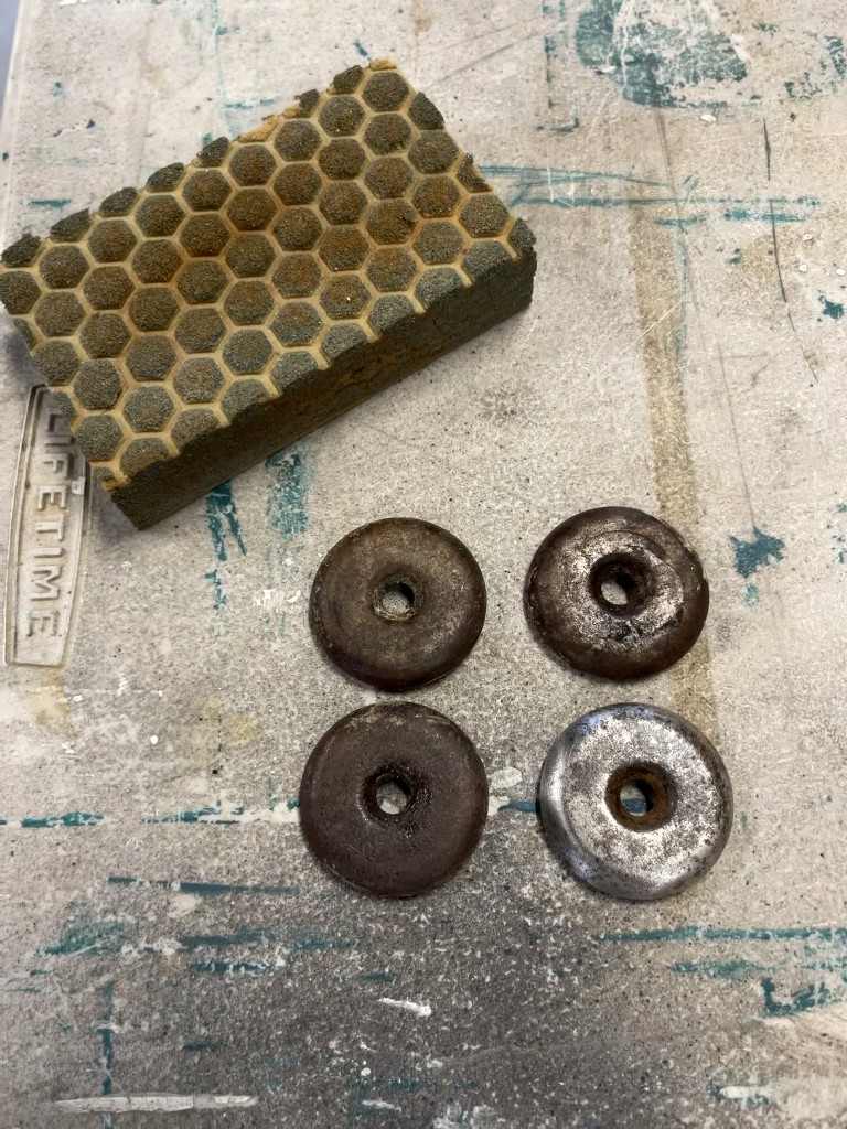 Using an 80 grit sanding block, I sanded the rust off of the metal footings that go on the bottom of the legs. I was able to unscrew the metal pieces from the 4 main legs but the two on the center support would not come off so I sanded those while they were in place. Once the pieces were as clean as I could get them, I sprayed them with a clear Rustoleum sealer and screwed them back to the bottom of the legs.