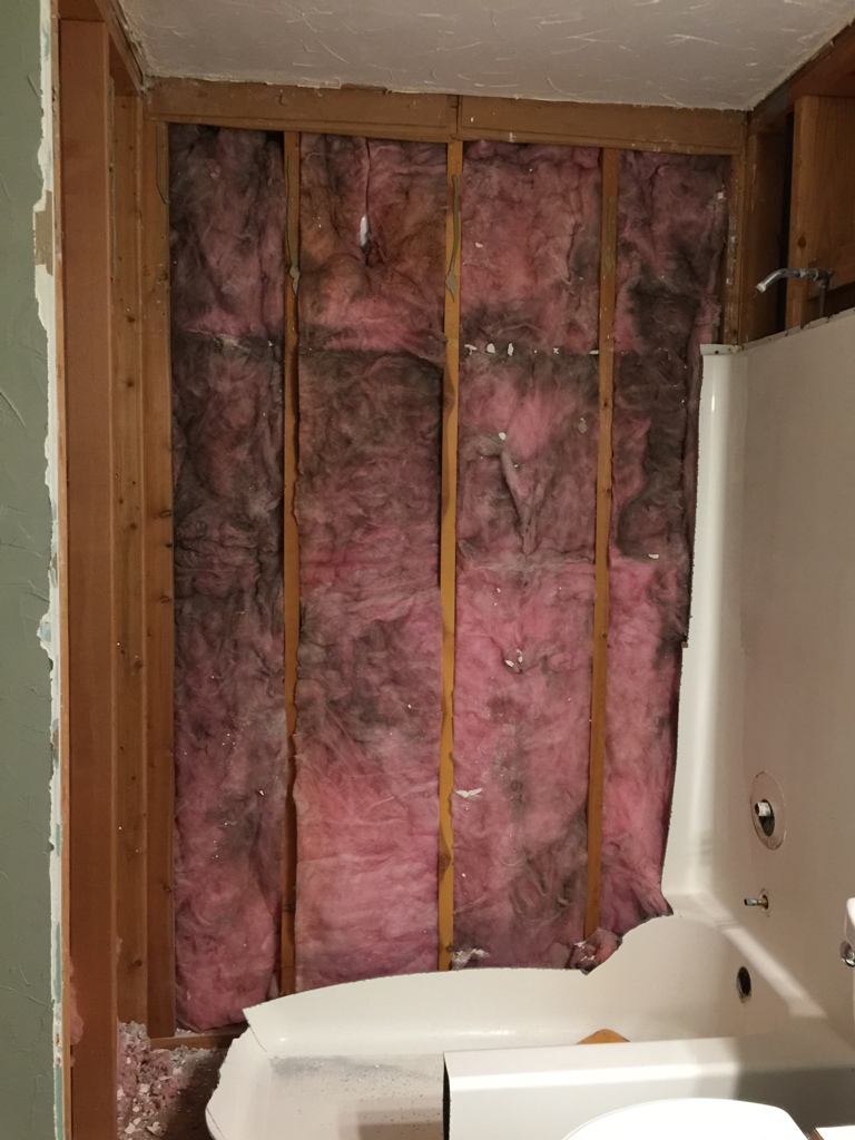 With the tub removed, it was time to take off the crown moulding so the drywall on the buffer wall could be removed. The moulding came of easy and quick. I figured the drywall would come off in one piece, nice & easy, right?! Nope! It came off in little iddy, biddy, pieces even though I was using a hammer and crowbar. Super messy too!