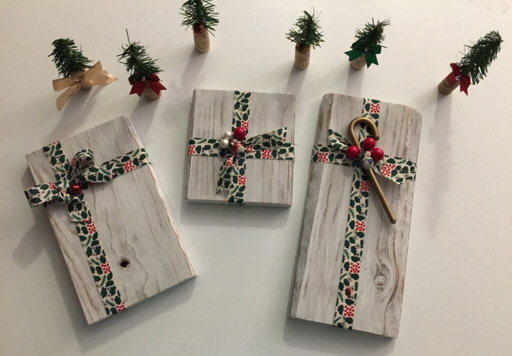 These faux wood packages are made from reclaimed wood. They have been lightly painted and sanded to give a shabby chic vibe. Decorated with ribbon and baubles, they make a perfect gift or Christmas decoration to add to your Holiday fun!